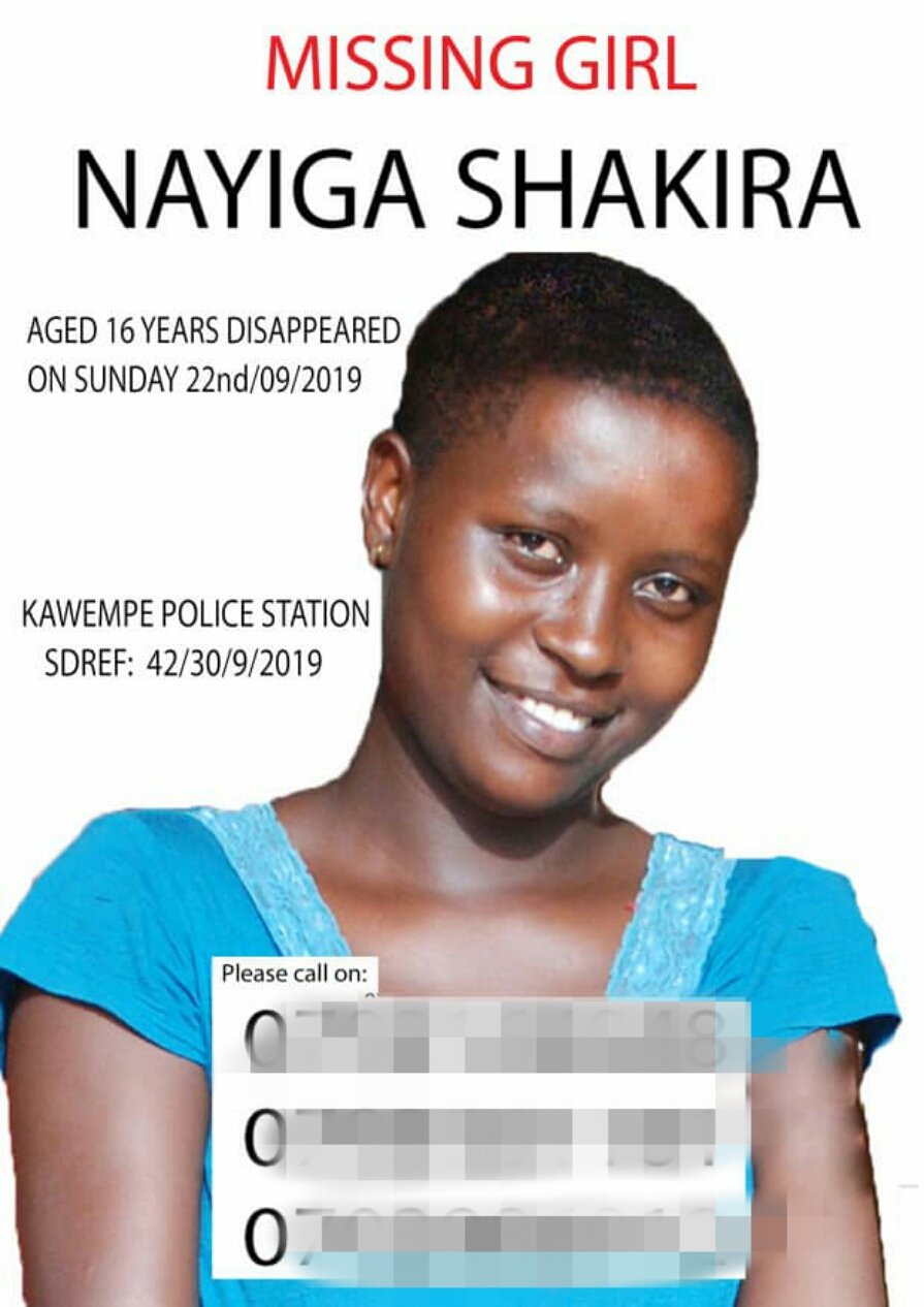 A 16-year-old girl identified as Naiga Shakira who was reported missing on Sunday 22/ 09/2019 in Kawempe and a case was filled under SDREF/30/9/2019 has been found according to police.