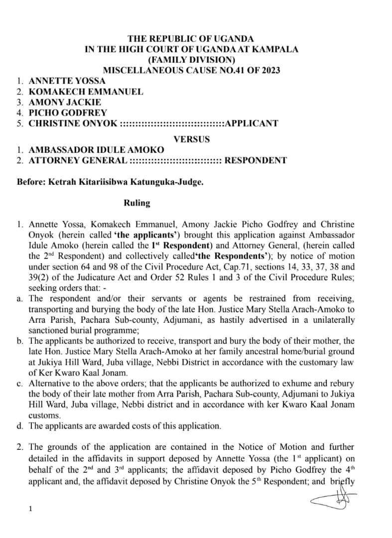 “The applicants be authorities be authorized to receive, transport, and burry the body of their mother, the late Hon. Justice Mary Stella Arach-Amoko at her family ancestral home/burial ground at Jukiya Hill ward, Juba Village, Nebbi district in accordance with the customary law of Ker Kwaro Kaal Jona.”-reads part of the ruling.