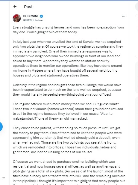 Bobi Wine heaps praise to two people whom he has named but he says they turned down offers of huge money to sell their land to operatives from government. He now refers to these as unsung heroes because they saved the party from suffocation of the regime while setting up the new offices.