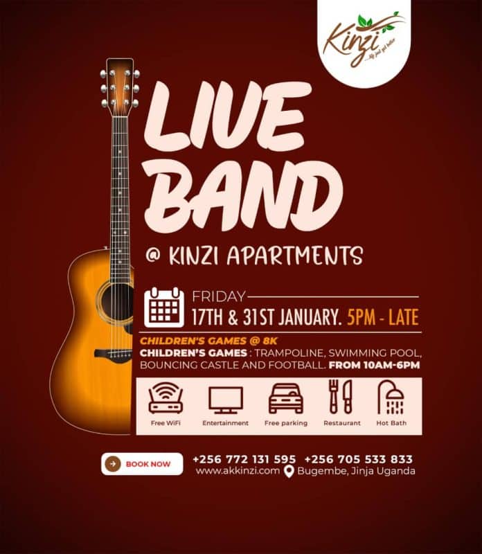 When and Where? Mark your calendars for this Friday 17th January 2025, , at Kinzi apartments, Bar and Restaurant in Bugembe. Doors open at 5pm, with the show kicking off at exactly 5pm till late. Whether you’re a seasoned fan or experiencing the magic of the Kinzi Live Band for the first time, this event is not to be missed.