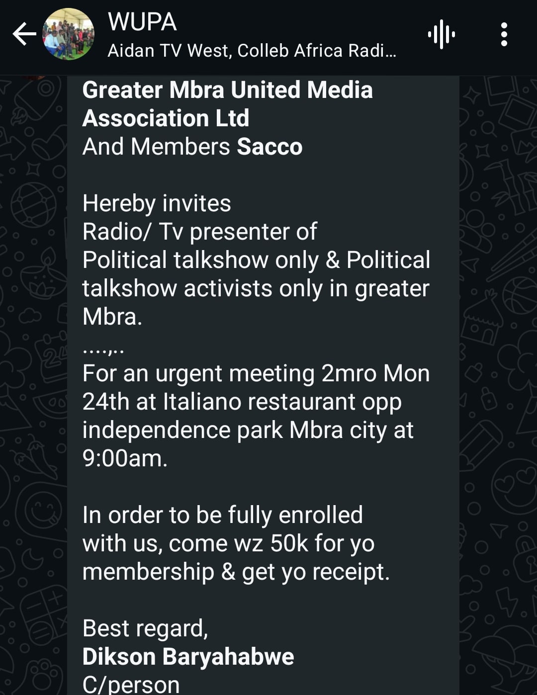 Led by Acting Chairperson Anita Matsika a Radio Sales Person the list is said to have been selected by Major Kiconco Tabaro, who has been accused of being discriminatory in his selection process according to the current discussions on their WhatsApp group.